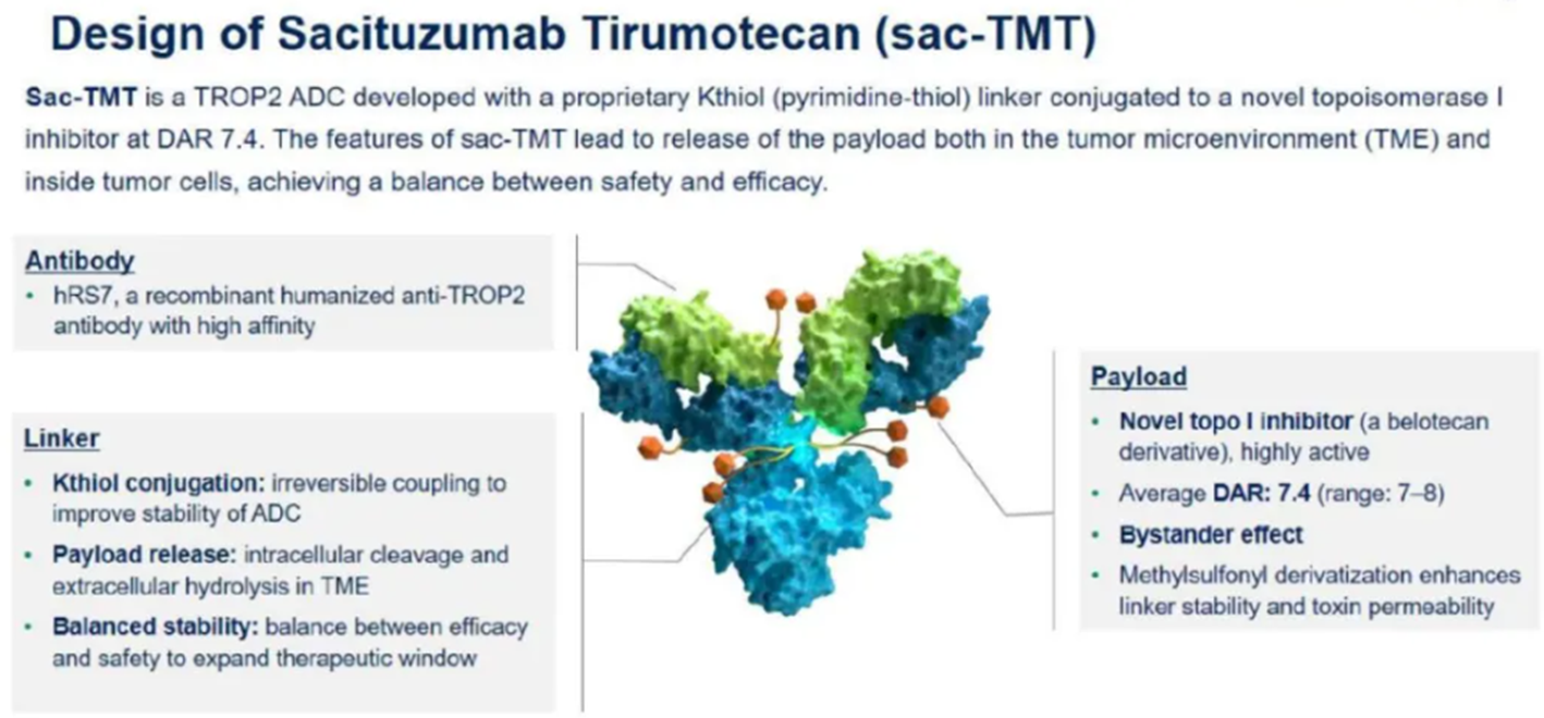 核心結(jié)構(gòu):由特異性識(shí)別TROP2的單克隆抗體、新型連接子和作為“彈頭”的化療藥物(一種貝洛替康衍生的拓?fù)洚悩?gòu)酶I抑制劑)三部分組成。