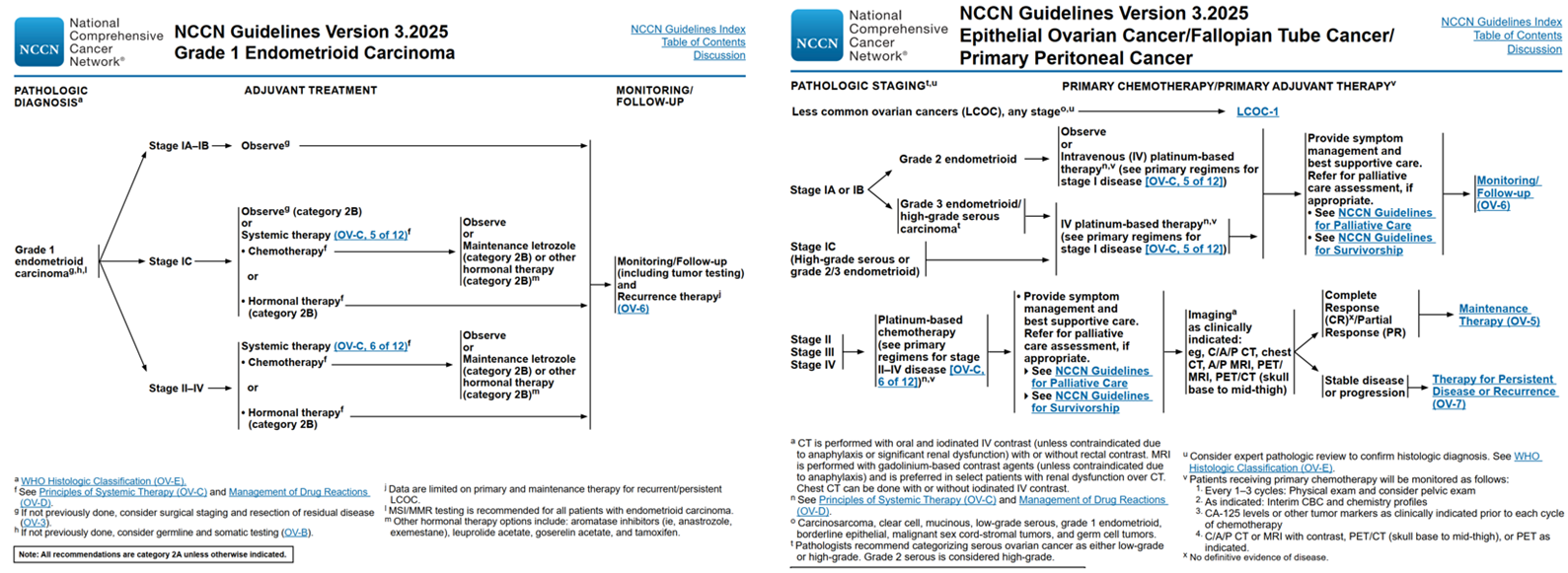 NCCN指南中針對G1患者,鼓勵對IA/IB期患者進(jìn)行觀察,IC期患者可選擇觀察或化療,II-IV期患者考慮在手術(shù)后接受全身輔助化療或激素治療。同時在備注里面提到,推薦所有卵巢子宮內(nèi)膜樣癌患者進(jìn)行MSI//MMR檢測,由于與林奇綜合征相關(guān)的錯配修復(fù)缺陷(MMRd)卵巢腫瘤中,子宮內(nèi)膜樣癌占比最高(該亞型中MMRd發(fā)生率為7%-10%),而在其他組織學(xué)亞型中MMRd較為罕見。因此有助于在卵巢癌患者中篩選出林奇綜合征病例,并為免疫檢查點抑制劑治療的適用人群選擇提供依據(jù)。